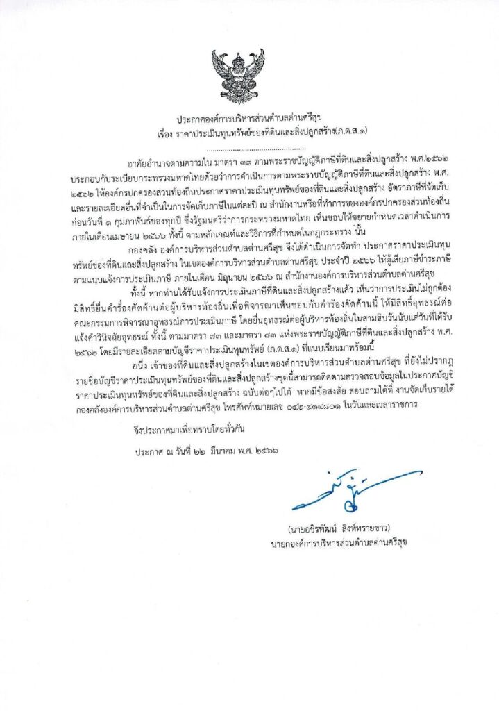 ประกาศ ราคาประเมินทุนทรัพย์ของที่ดินและสิ่งปลูกสร้าง(ภ.ด.ส.1)