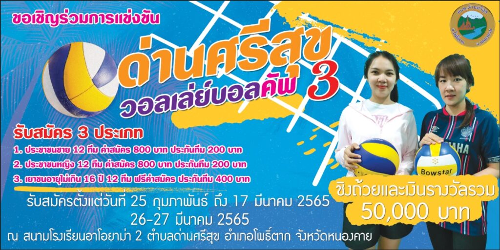 ขอเชิญร่วมการแข่งขัน “ด่านศรีสุขวอลเลย์บอลคัพ ครั้งที่ 3” ชิงถ้วยและเงินรางวัลรวมกว่า 50,000 บาท