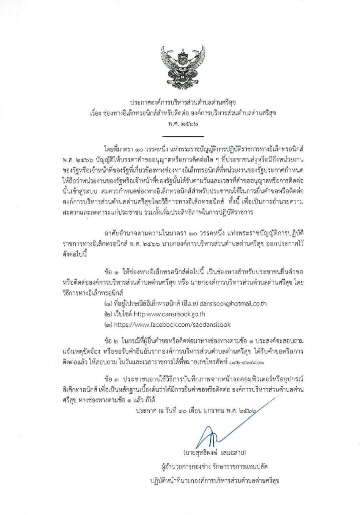 ประกาศ เรื่อง ช่องทางอิเล็กทรอนิกส์สำหรับติดต่อ องค์การบริหารส่วนตำบลด่านศรีสุข 2566