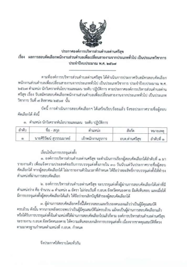 ประกาศ เรื่อง ผลการสอบคัดเลือกพนักงานส่วนตำบลเพื่อเปลี่ยนสายงานจากประเภททั่วไป เป็นประเภทวิชาการ