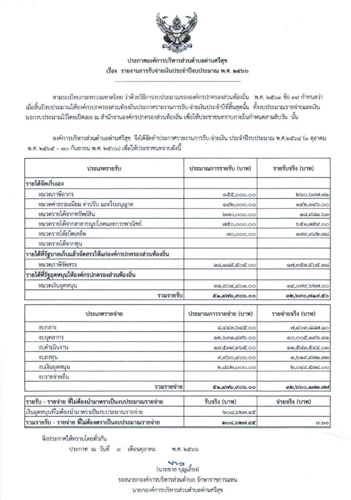 ประกาศรายงานการรับจ่ายเงินประจำปีงบประมาณ 2566