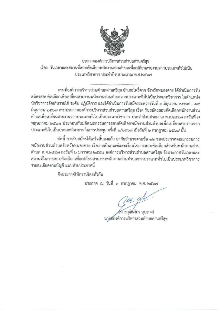 ประกาศ เรื่อง วันเวลาและสถานที่สอบคัดเลือกพนักงานส่วนตำบลเพื่อเปลี่ยนงานจากประเภททั่วไปเป็นประเภทวิชาการ