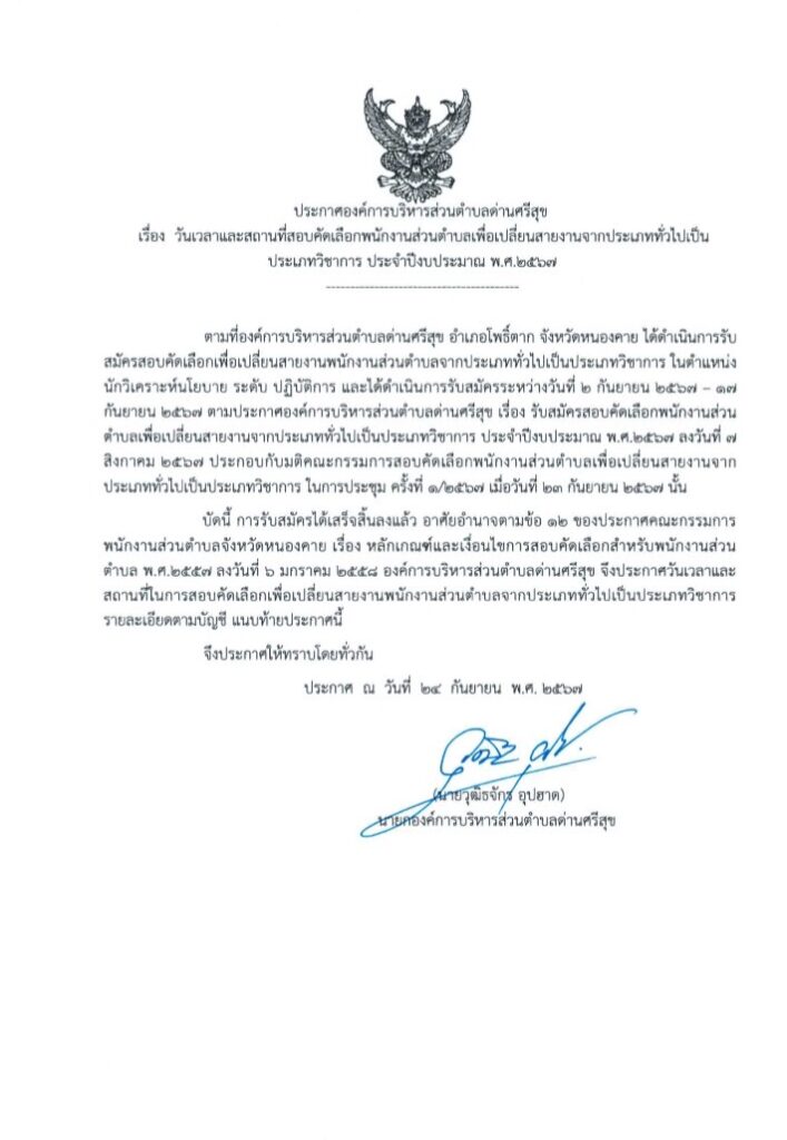 เรื่อง วันเวลาและสถานที่สอบคัดเลือกพนักงานส่วนตำบลเพื่อเปลี่ยนสายงาน จากประเภททั่วไปเป็นประเภทวิชาการ
