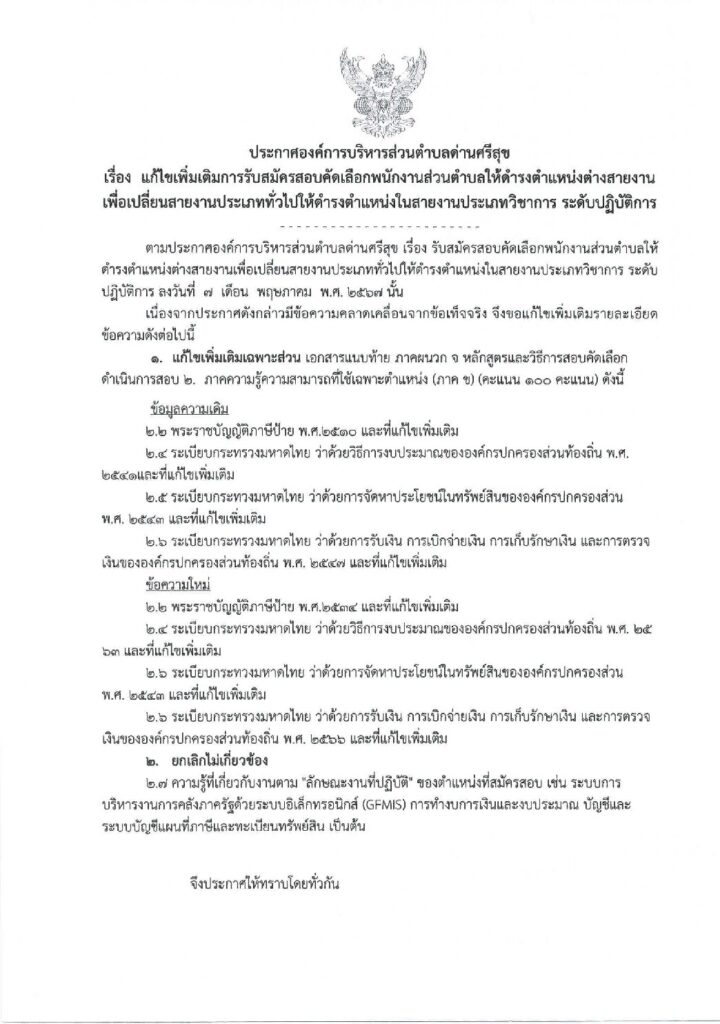 ประกาศ แก้ไขเพิ่มเติมการรับสมัครสอบคัดเลือกพนักงานส่วนตำบลให้ดำรงตำแหน่งต่างสายงานฯ