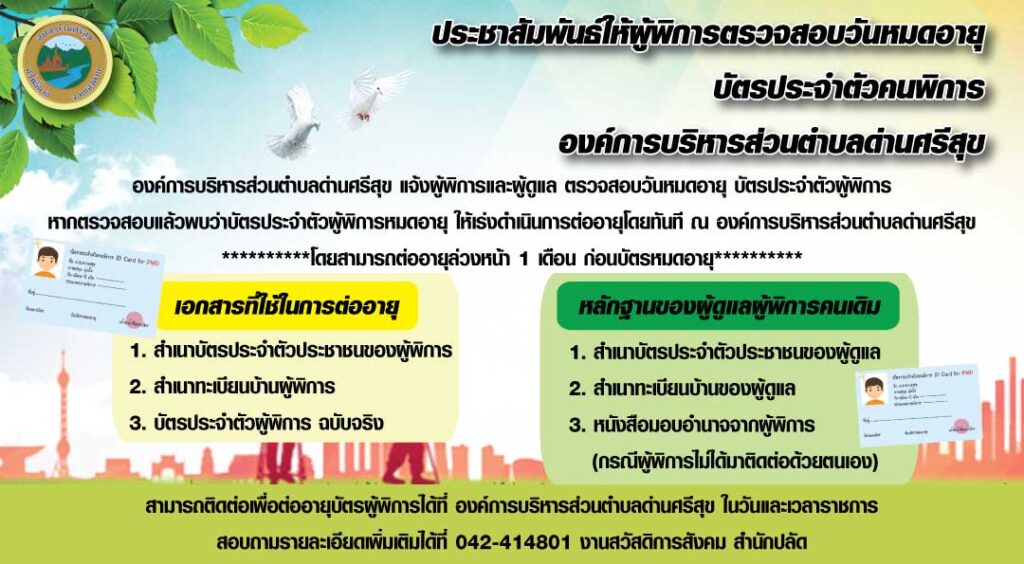 ขอให้ผู้พิการตรวจสอบวันหมดอายุ บัตรประจำตัวคนพิการ หากหมดอายุให้เร่งดำเนินการต่ออายุโดยทันทีเพื่อสิทธิประโยชน์ ทั้งนี้สามารถต่ออายุบัตรล่วงหน้า 1 เดือน ก่อนบัตรหมดอายุ โดยแนบเอกสารที่ใช้ในการต่ออายุ และผู้ดูแลคนพิการคนเดิม (กรณีผู้พิการไม่ได้มาติดต่อด้วยตนเอง) ณ สำนักงานองค์การบริหารส่วนตำบลด่านศรีสุข ในวันและเวลาราชการ
