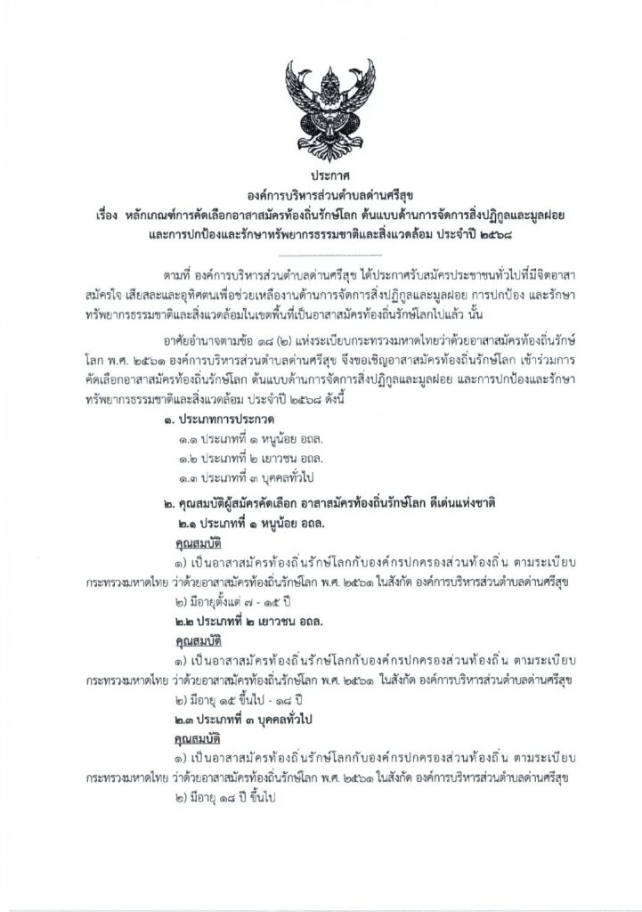 ประกาศ เรื่อง หลักเกณฑ์การคัดเลือกอาสาสมัครท้องถิ่นรักษ์โลก ต้นแบบด้านการจัดการสิ่งปฏิกูลและมูลฝอย และการปกป้องและรักษาทรัพยากรธรรมชาติและสิ่งแวดล้อม ประจำปี ๒๕๖๖๘