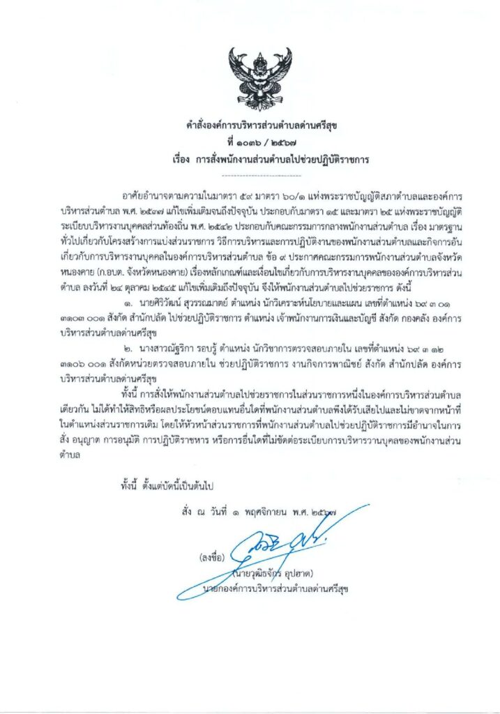 เรื่อง การสั่งพนักงานส่วนตำบลไปช่วยปฏิบัติราชการ