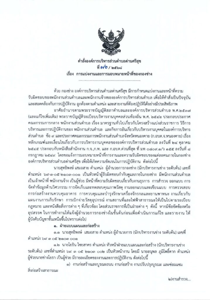 คำสั่งการแบ่งงานและมอบหมายหน้าที่ของกองช่าง ที่ 192/2568