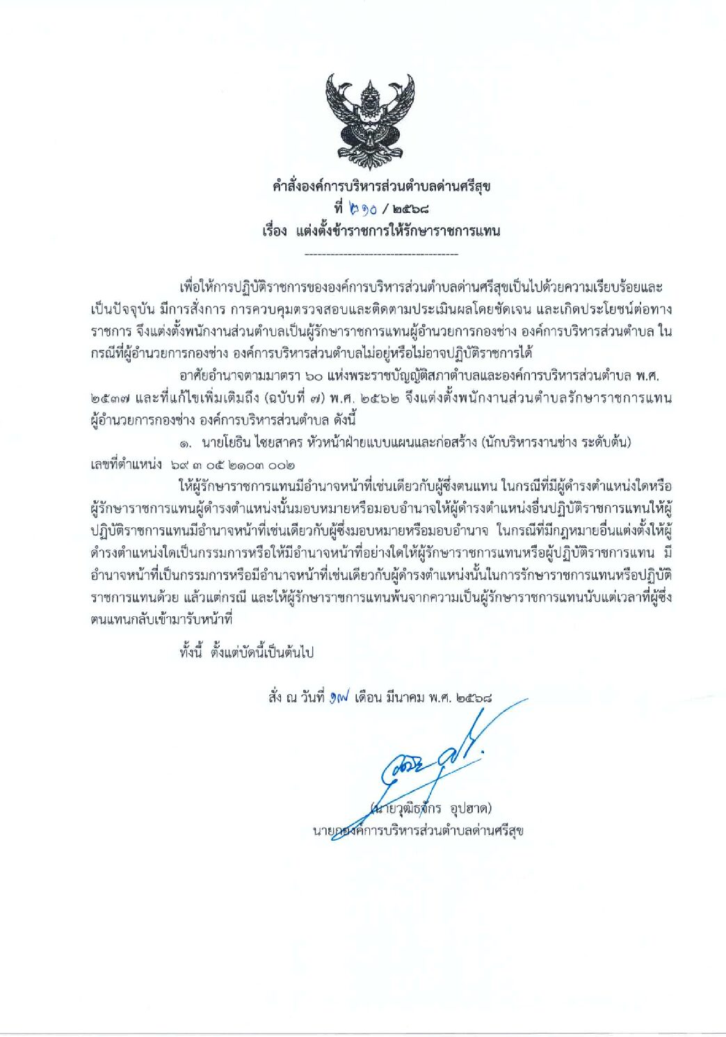 คำสั่งองค์การบริหารส่วนตำบลด่านศรีสุข