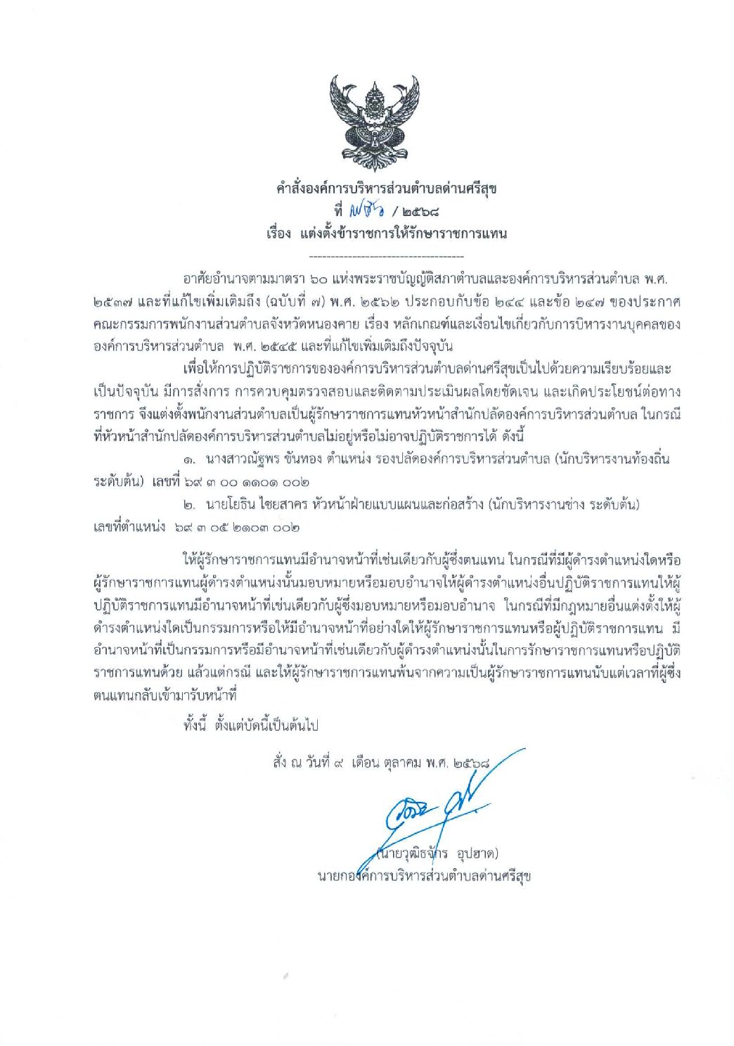 คำสั่งองค์การบริหารส่วนตำบลด่านศรีสุข