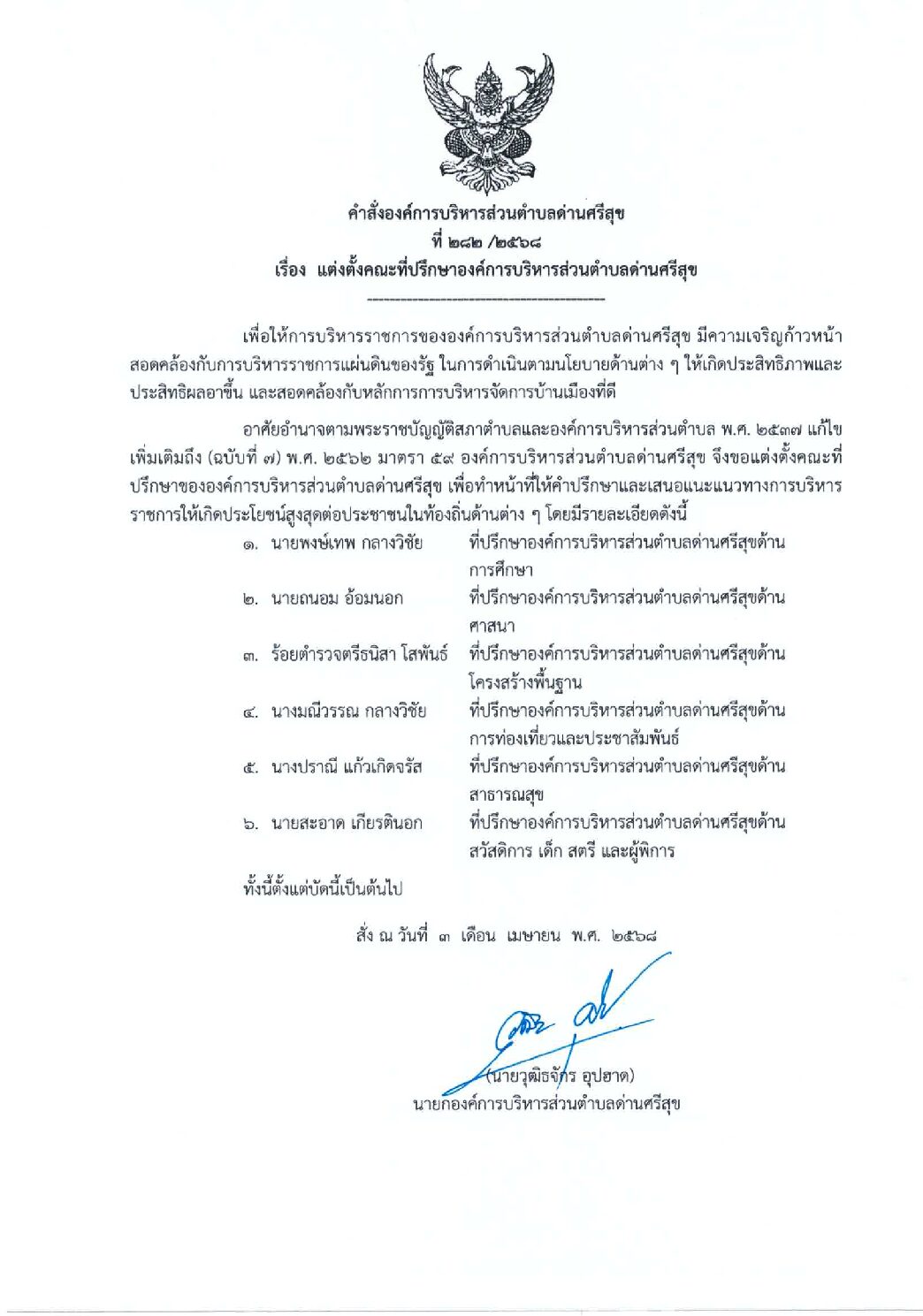 คำสั่งแต่งตั้งคณะที่ปรึกษาองค์การบริหารส่วนตำบลด่านศรีสุข ที่ 282/2568 03 เม.ย. Download Download is available until [expire_date] Version Download 0 File Size 159.05 KB File Count 1 Create Date 3 เมษายน 2025 Last Updated 10 เมษายน 2025 คำสั่งแต่งตั้งคณะที่ปรึกษาองค์การบริหารส่วนตำบลด่านศรีสุข ที่ 282/2568 คำสั่งที่ 282 ทับ 2568 Attachments คำสั่งที่ 282 ทับ 2568 (160 kB)คำสั่งที่ 282 ทับ 2568 (160 kB) คู่มือการปฏิบัติราชการ การขึ้นทะเบียนพาณิชย์ คำสั่งการแบ่งงานและการมอบหมายหน้าที่รับผิดชอบของกองคลัง ที่ 291/2568