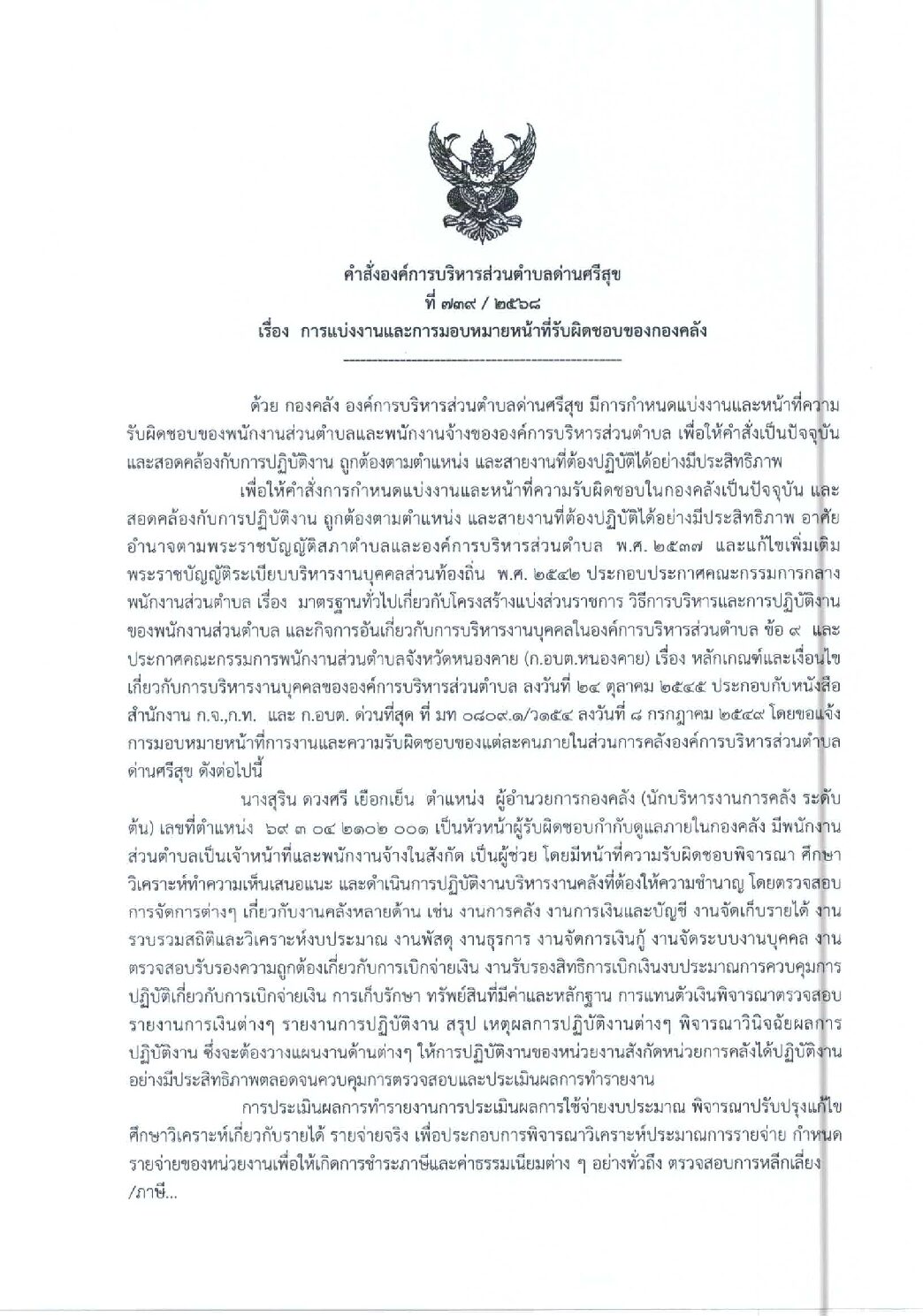 คำสั่ง เรื่อง การแบ่งงานและการมอบหมายหน้าที่รับผิดชอบของกองคลัง