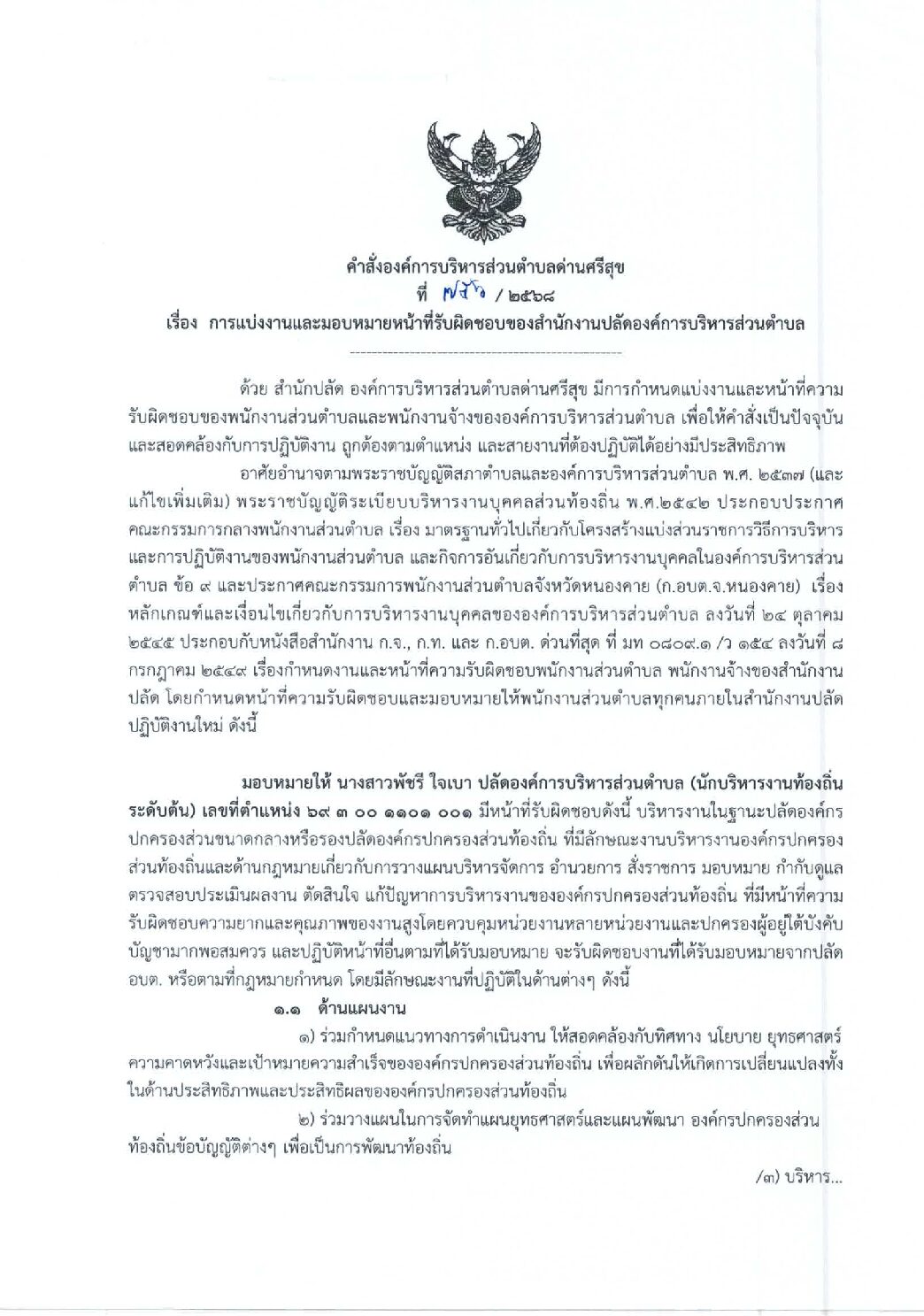 คำสั่ง เรื่อง การแบ่งงานและมอบหมายหน้าที่รับผิดชอบของสำนักงานปลัดองค์การบริหารส่วนตำบล