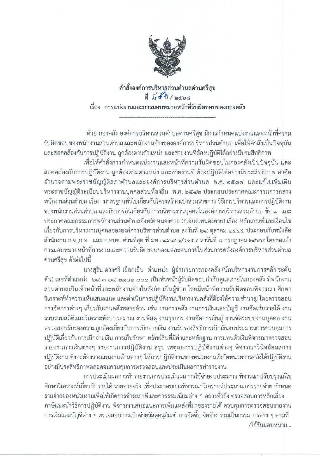 คำสั่ง เรื่อง การแบ่งงานและมอบหมายหน้าที่รับผิดชอบของกองคลัง