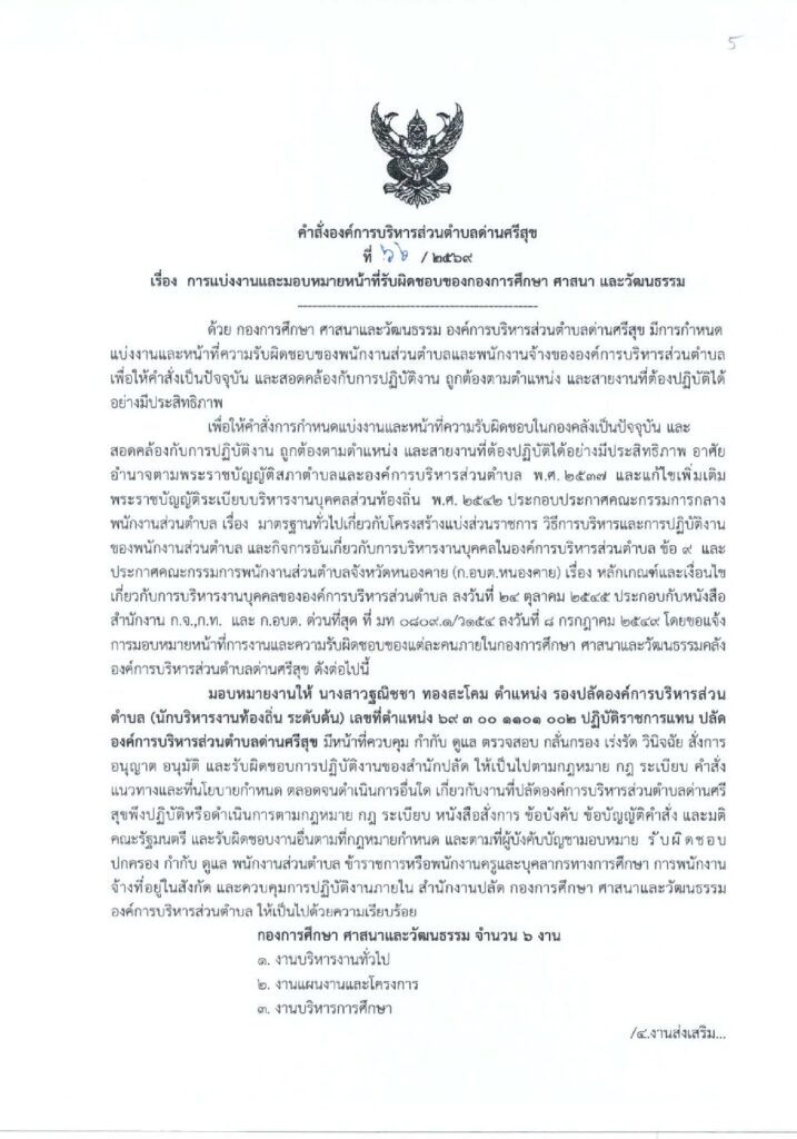 คำสั่ง เรื่อง การแบ่งงานและมอบหมายหน้าที่รับผิดชอบของกองการศึกษา ศาสนา และวัฒนธรรม