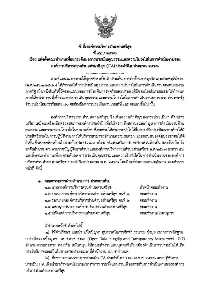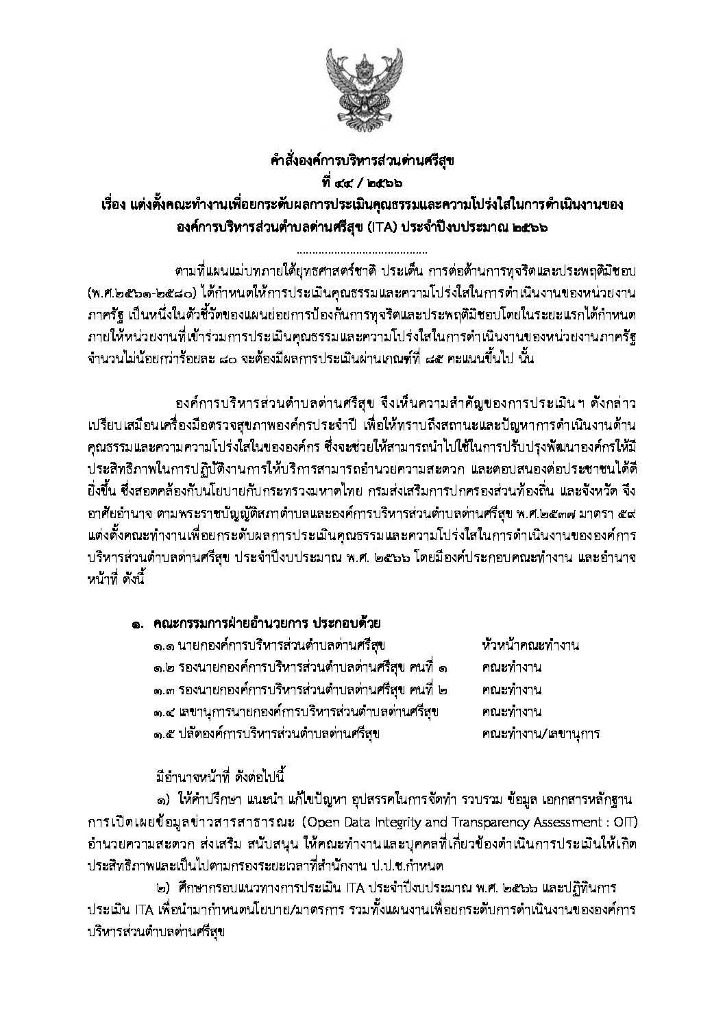 คำสั่ง แต่งตั้งคณะทำงานเพื่อยกระดับผลการประเมินคุณธรรมและความโปร่งใสในการดำเนินงาน (ITA) 2566 04 ม.ค. Download Download is available until [expire_date] Version Download 1 File Size 306.87 KB File Count 1 Create Date 4 มกราคม 2023 Last Updated 20 เมษายน 2023 คำสั่ง แต่งตั้งคณะทำงานเพื่อยกระดับผลการประเมินคุณธรรมและความโปร่งใสในการดำเนินงาน (ITA) 2566 Attachments แต่งตั้งคณะทำงานเพื่อยกระดับ (ITA) ประจำปีงบประมาณ 2566 (307 kB) ประกาศ เรื่อง ผลการสอบคัดเลือกพนักงานจ้าง ประจำปี พ.ศ.2566 การรายงานผลการนำการประเมินจริยธรรม ไปใช้ในกระบวนการบริหารทรัพยากรบุคคล