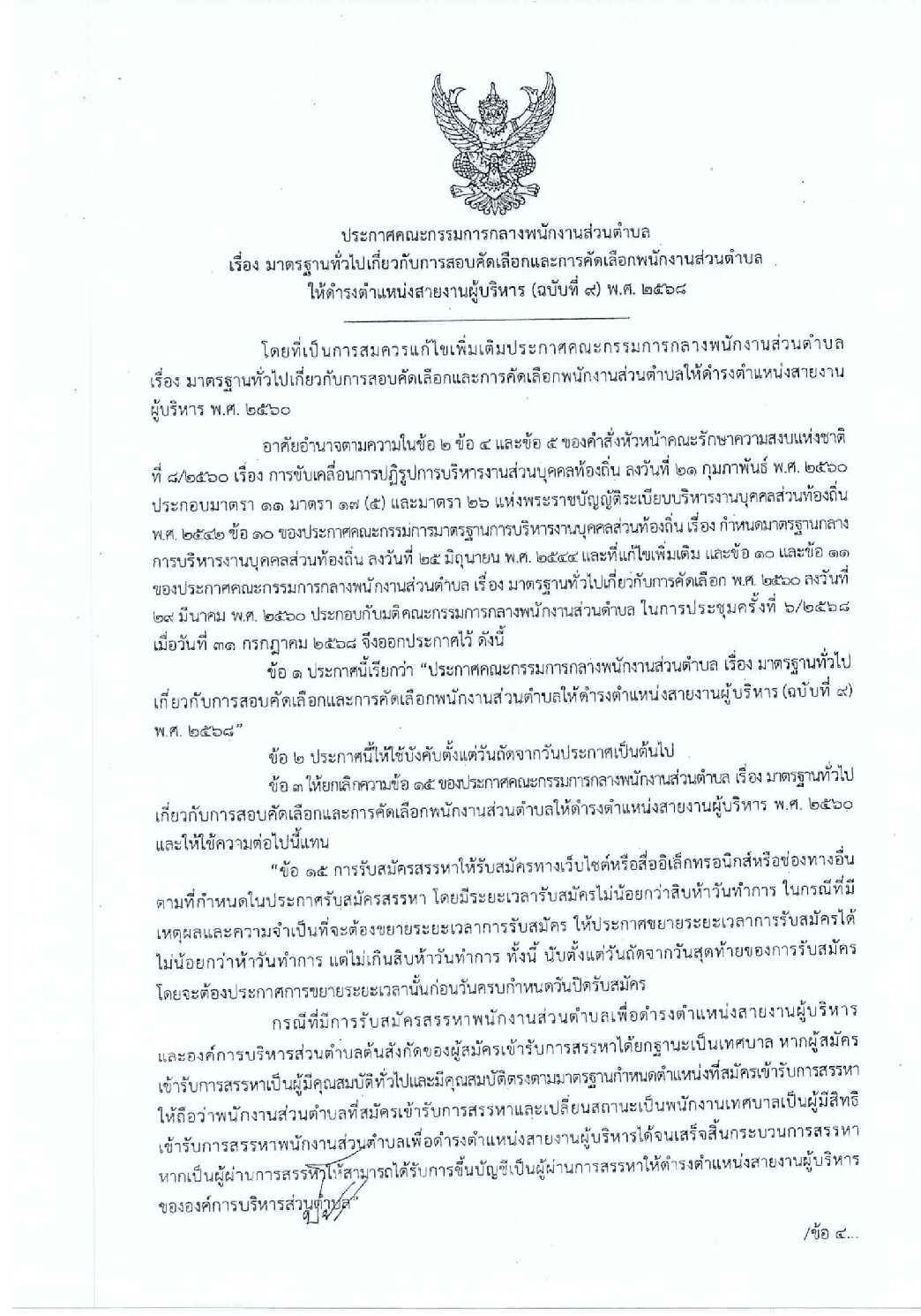 ประกาศคณะกรรมการกลางพนักงานส่วนตำบล เรื่อง มาตรฐานทั่วไปเกี่ยวกับการสอบคัดเลือกและคัดเลือกพนักงานส่วนตำบล ให้ดำรงตำแหน่งสายงานผู้บริหาร (ฉบับที่ 9) พ.ศ. 2568