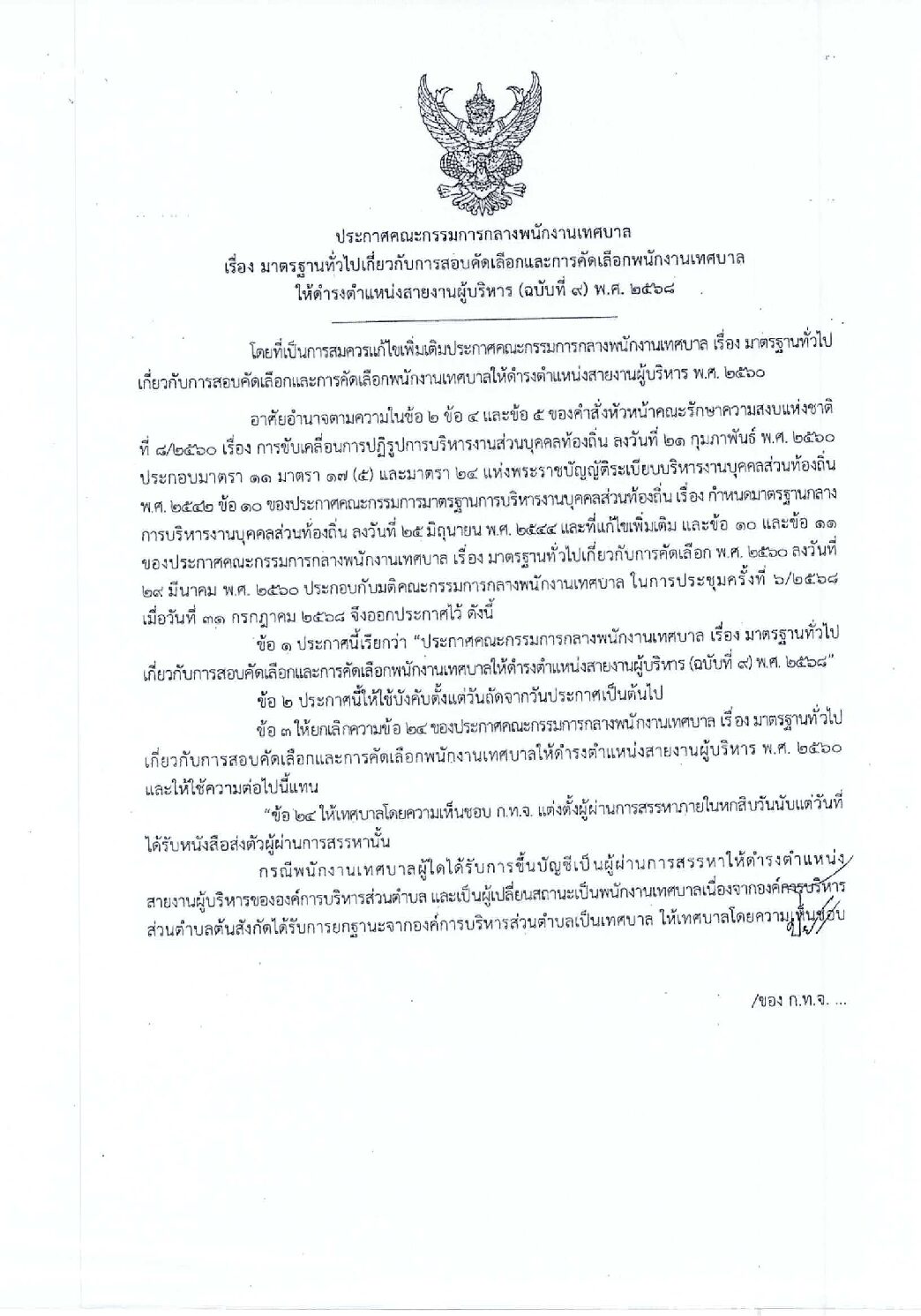 ประกาศคณะกรรมการกลางพนักงานเทศบาล เรื่อง มาตรฐานทั่วไปเกี่ยวกับการสอบคัดเลือกและคัดเลือกพนักงานส่วเทศบาล ให้ดำรงตำแหน่งสายงานผู้บริหาร (ฉบับที่ 9) พ.ศ. 2568