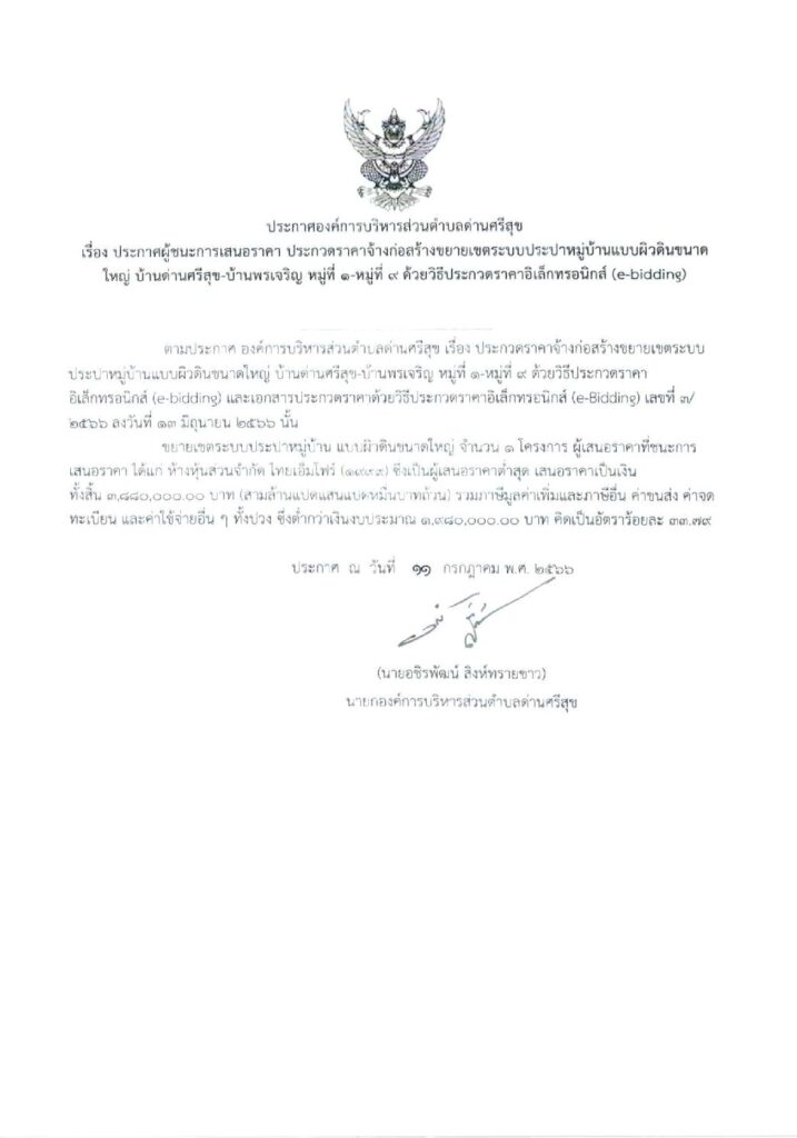 ประกาศผู้ชนะการเสนอราคา ประกวดราคาจ้างก่อสร้างขยายเขตประปาหมู่บ้านแบบผิวดินขนาดใหญ่(บ้านด่านศรีสุข-บ้านพรเจริญ)