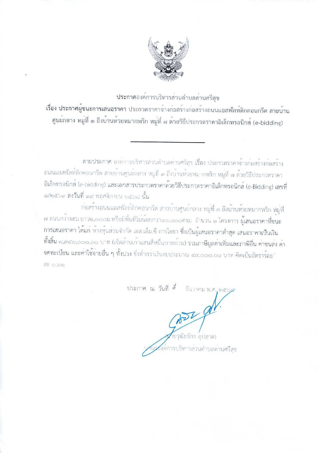 ประกาศผู้ชนะการเสนอราคา ประกวดราคาจ้างก่อสร้างก่อสร้างถนนแอสฟัลท์ติกคอนกรีต สายบ้านศูนย์กลาง หมู่ที่ 3 ถึงบ้านห้วยหมากพริก หมู่ที่ 7 ด้วยวิธีประกวดราคาอิเล็กทรอนิกส์ (e-bidding)