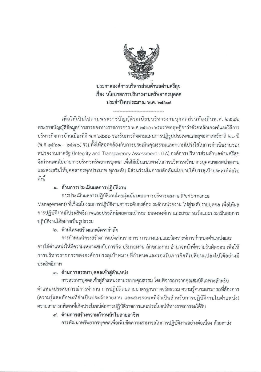 ประกาศ เรื่อง นโยบายการบริหารงานทรัพยากรบุคคล ประจำปีงบประมาณ พ.ศ. 2567