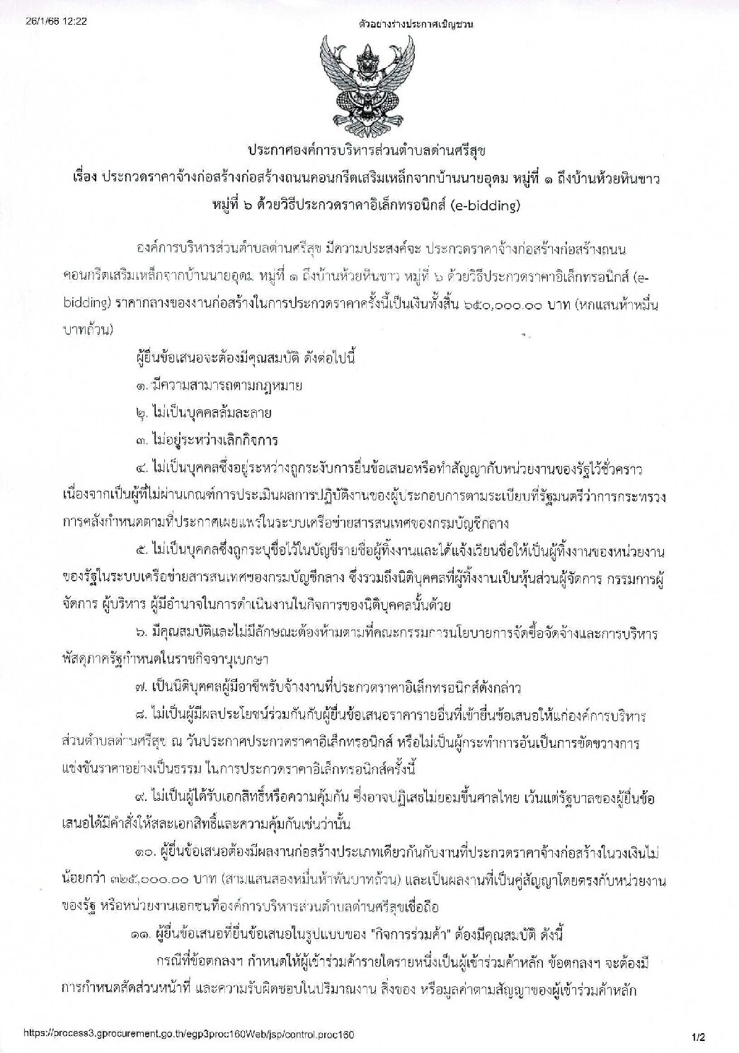 ประกาศ เรื่อง ประกวดราคาจ้างก่อสร้างถนนคอนกรีตเสริมเหล็กจากบ้านนายอุดม หมู่ที่ 1 ถึงบ้านห้วยหินขาว หมู่ที่ 6 ด้วยวิธีประกวดราคาอิเล็กทรอนิกส์(e-bidding) 26 ม.ค. Download Download is available until [expire_date] Version Download 0 File Size 464.51 KB File Count 1 Create Date 26 มกราคม 2023 Last Updated 26 มกราคม 2023 ประกาศ เรื่อง ประกวดราคาจ้างก่อสร้างถนนคอนกรีตเสริมเหล็กจากบ้านนายอุดม หมู่ที่ 1 ถึงบ้านห้วยหินขาว หมู่ที่ 6 ด้วยวิธีประกวดราคาอิเล็กทรอนิกส์(e-bidding) Attachments ประกาศ เรื่อง ประกวดราคาจ้างก่อสร้างถนน คสล.(จากบ้านนายอุดม ม.1-บ้านห้วยหินขาว ม.6) (465 kB) แนวทางปฏิบัติ Dos & Don’t ประกาศ เรื่อง เผยแพร่แผนการจัดซื้อจัดจ้าง ประจำปีงบประมาณ พ.ศ.2566(ม.1-ม.9)