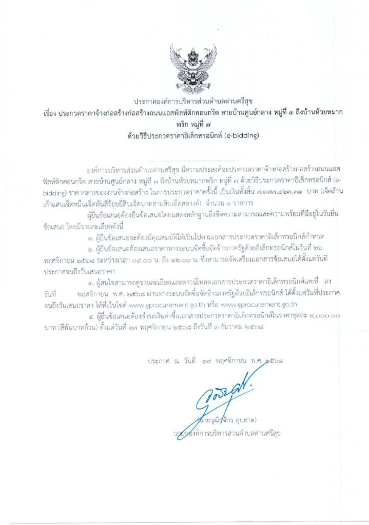 ประกาศ เรื่อง ประกวดราคาจ้างก่อสร้างก่อสร้างถนนแอสฟัลท์ติกคอนกรีต สายบ้านศูนย์กลาง หมู่ที่ 3 ถึงบ้านห้วยหมากพริก หมู่ที่ 7 ด้วยวิธีประกวดราคาอิเล็กทรอนิกส์ (e-bidding)