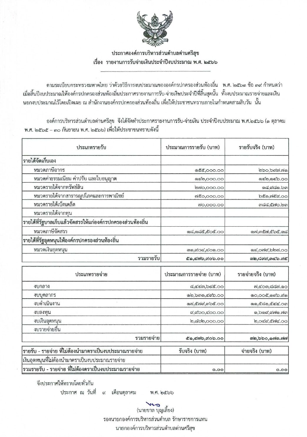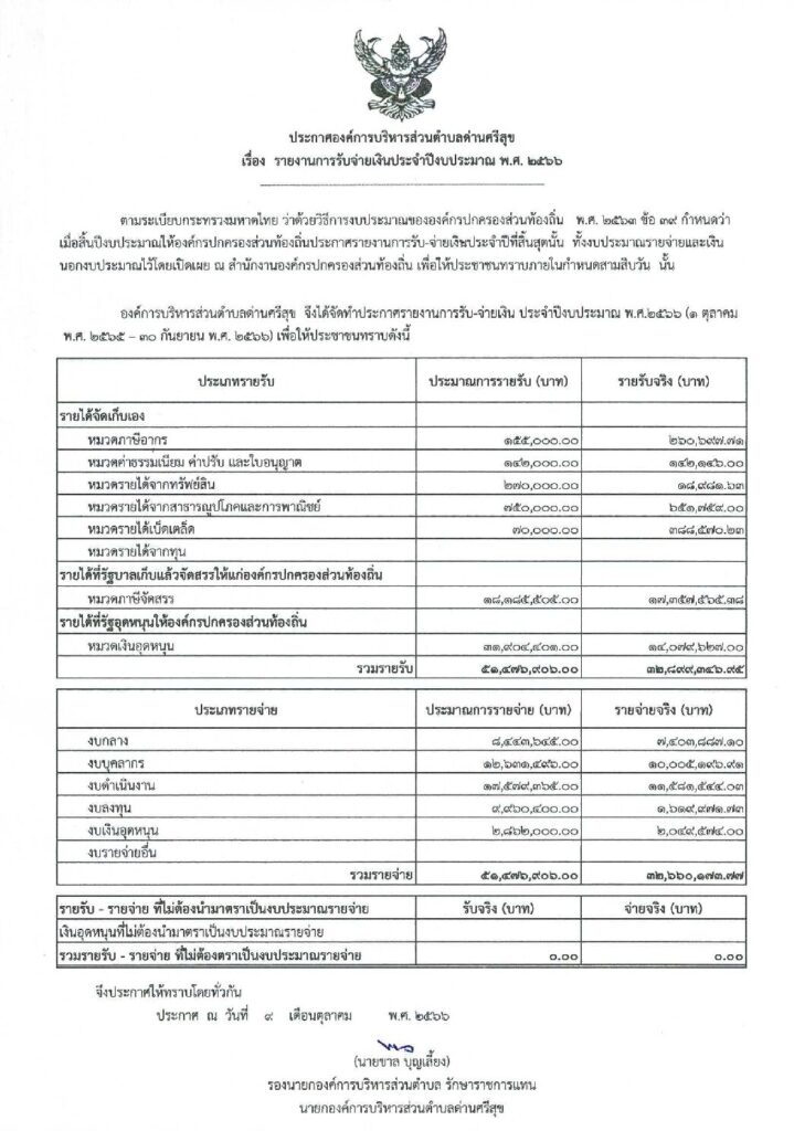 ประกาศ เรื่อง รายงานการรับจ่ายเงินประจำปีงบประมาณ พ.ศ.๒๕๖๖