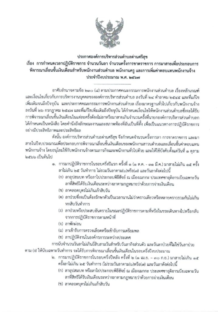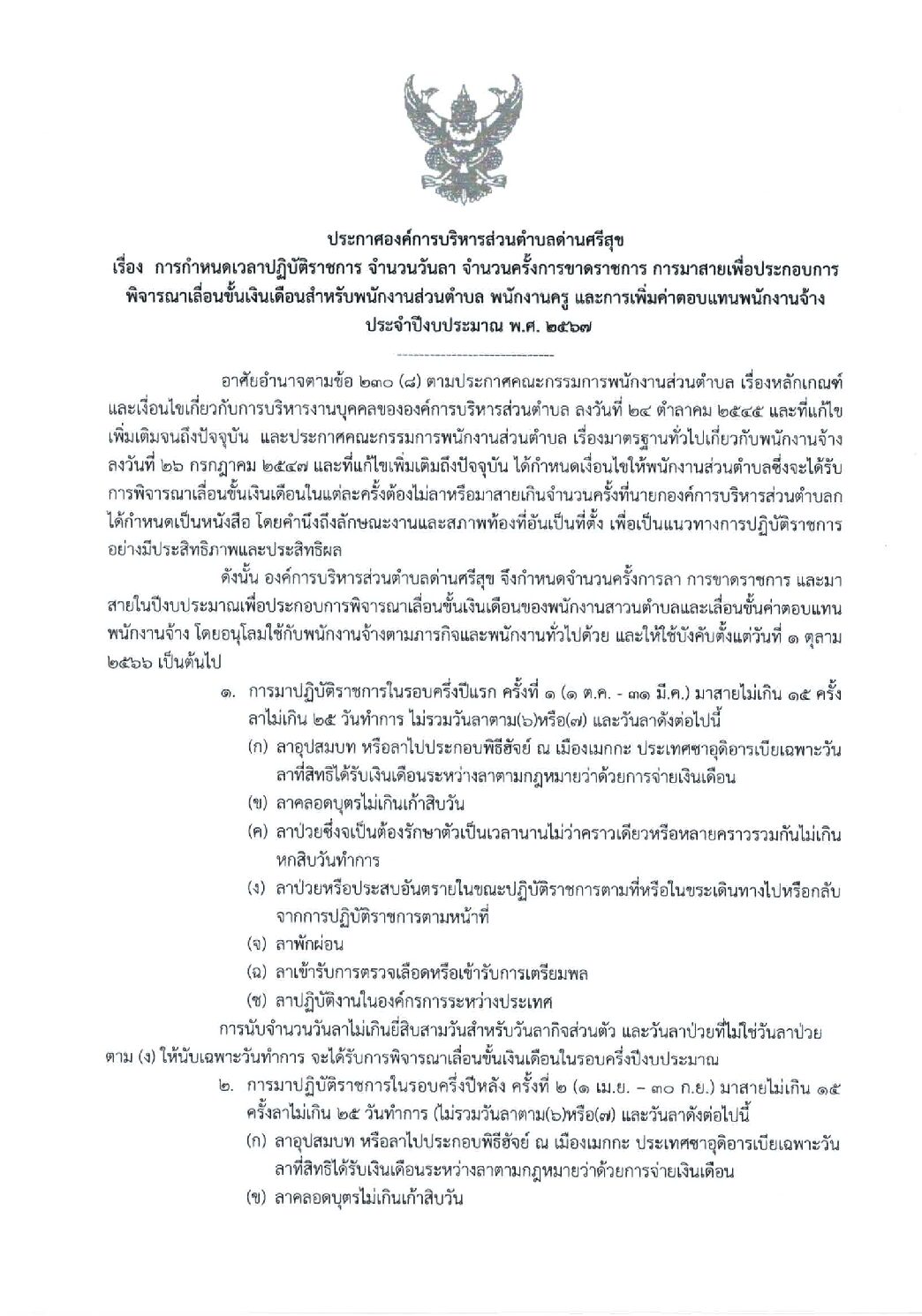 ประกาศ เรื่อง การกำหนดเวลาปฏิบัติราชการ จำนวนวันลา จำนวนครั้งการขาดราชการพนักงานส่วนตำบล ประจำปีงบประมาณ พ.ศ.๒๕๖๗