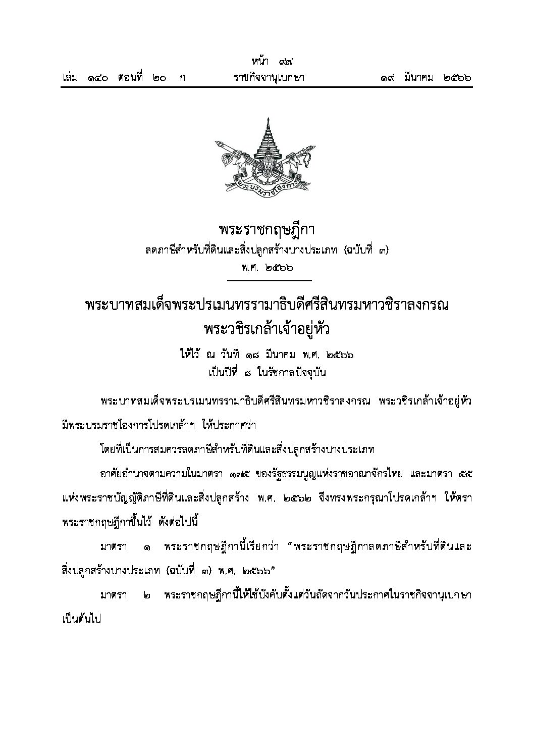พระราชกฤษฎีกา ลดภาษีสำหรับที่ดินและสิ่งปลูกสร้างบางประเภท (ฉบับที่ 3) พ.ศ.2566 21 มี.ค. Download Download is available until [expire_date] Version Download 0 File Size 109.93 KB File Count 1 Create Date 21 มีนาคม 2023 Last Updated 21 มีนาคม 2023 พระราชกฤษฎีกา ลดภาษีสำหรับที่ดินและสิ่งปลูกสร้างบางประเภท (ฉบับที่ 3) พ.ศ.2566 Attachments พระราชกฤษฎีกา ลดภาษีสำหรับที่ดินและสิ่งปลูกสร้างบางประเภท (ฉบับที่ 3) พ.ศ.2566 (110 kB) รายงานผลการนำแผนไปปฏิบัติ ประจำปีงบประมาณ พ.ศ. 2565 (รอบ 12 เดือน) รายงานผลตามนโยบาย No Gift Policy ประจำปี 2566