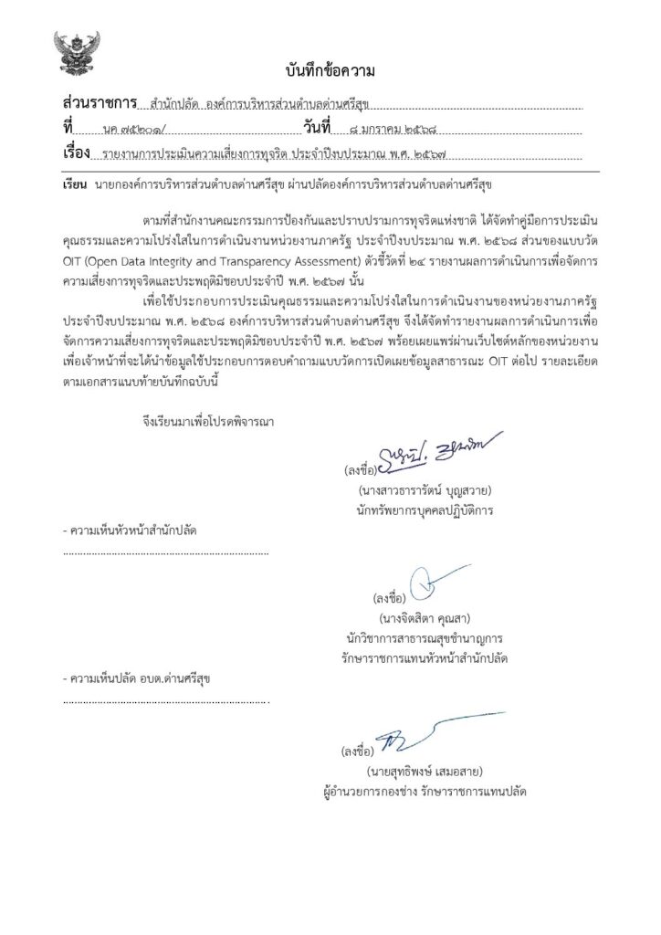 รายงานผลการดำเนินการเพื่อจัดการความเสี่ยงการทุจริตและประพฤติมิชอบประจำปี พ.ศ. 2567