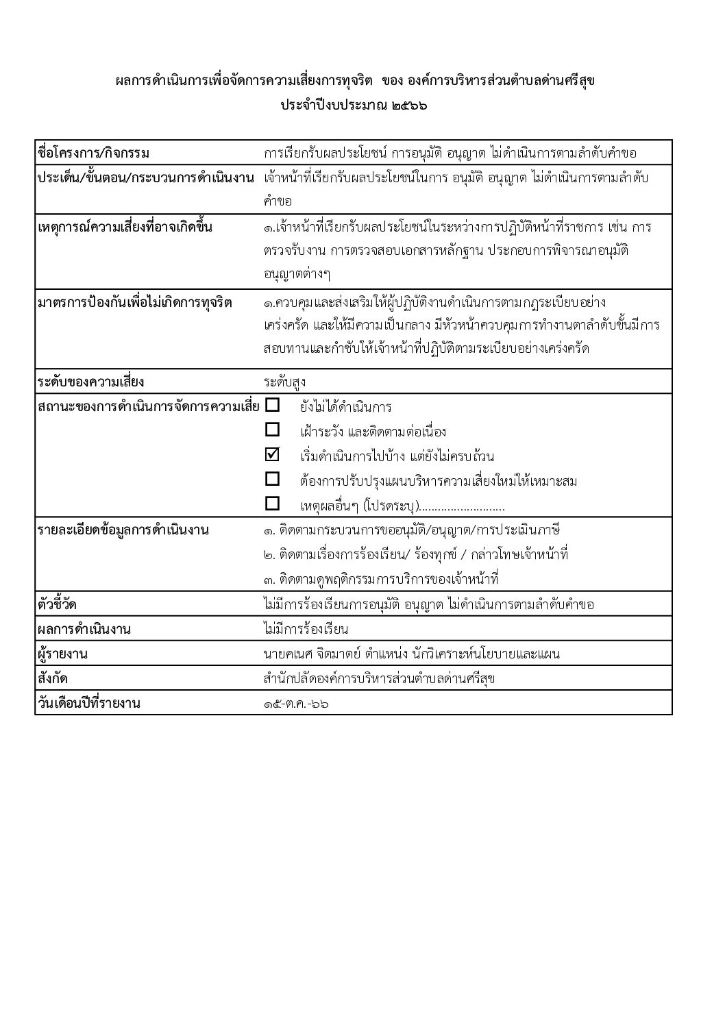 รายงานผลการดำเนินการเพื่อจัดการความเสี่ยงการทุจริตและประพฤติมิชอบ ประจำปี 2566
