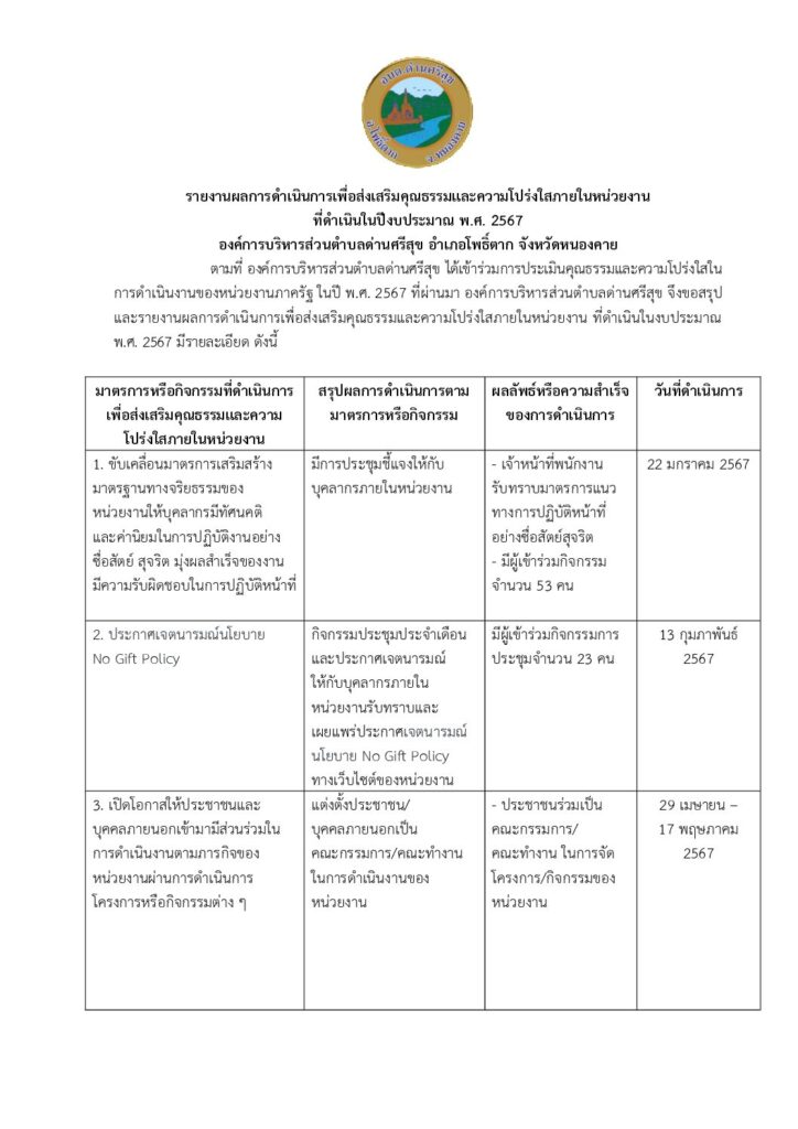 รายงานผลการดำเนินการเพื่อส่งเสริมคุณธรรมและความโปร่งใสภายในหน่วยงาน ที่ดำเนินในปีงบประมาณ พ.ศ. 2567