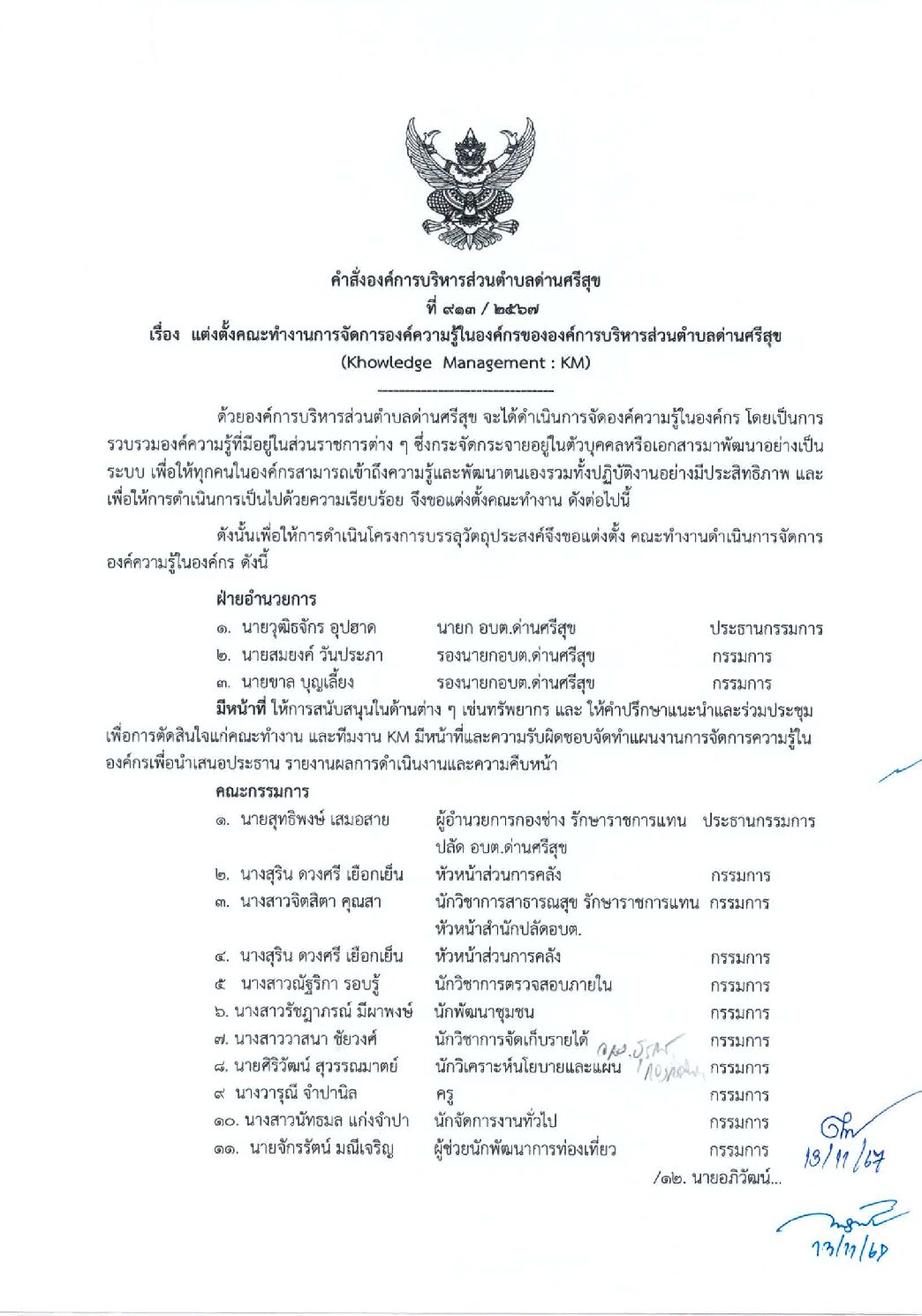 เรื่อง แต่งตั้งคณะทำงานการจัดการองค์ความรู้ในองค์กรขององค์การบริหารส่วนตำบลด่านศรีสุข