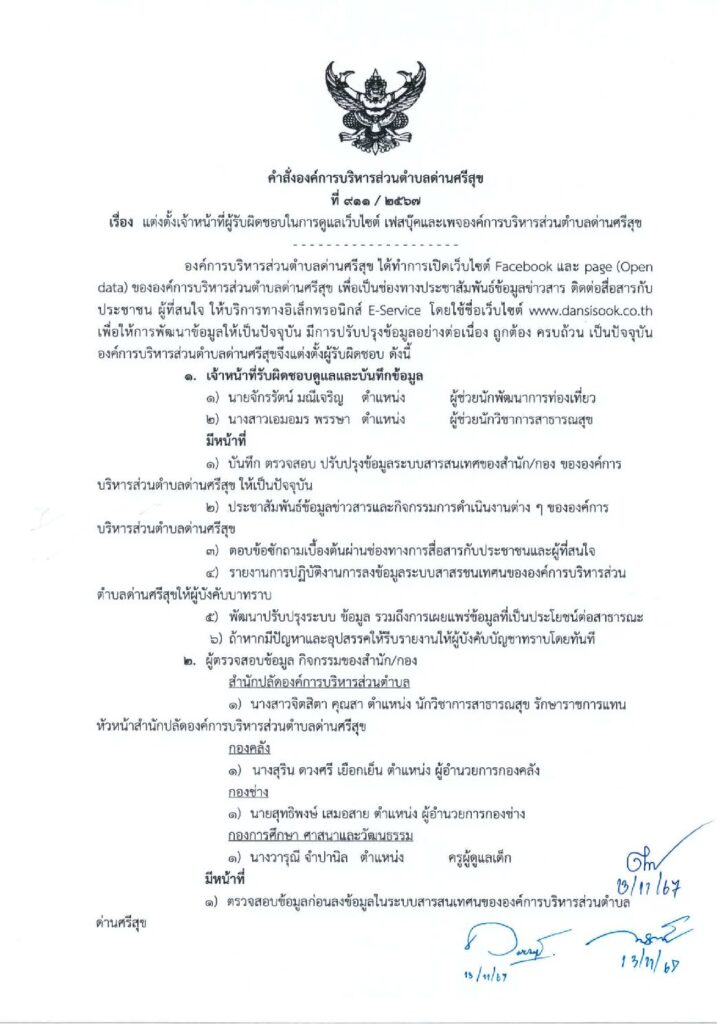เรื่อง แต่งตั้งเจ้าหน้าที่ผู้รับผิดชอบในการดูแลเว็บไซต์ เฟสบุ๊คและเพจองค์การบริหารส่วนตำบลด่านศรีสุข