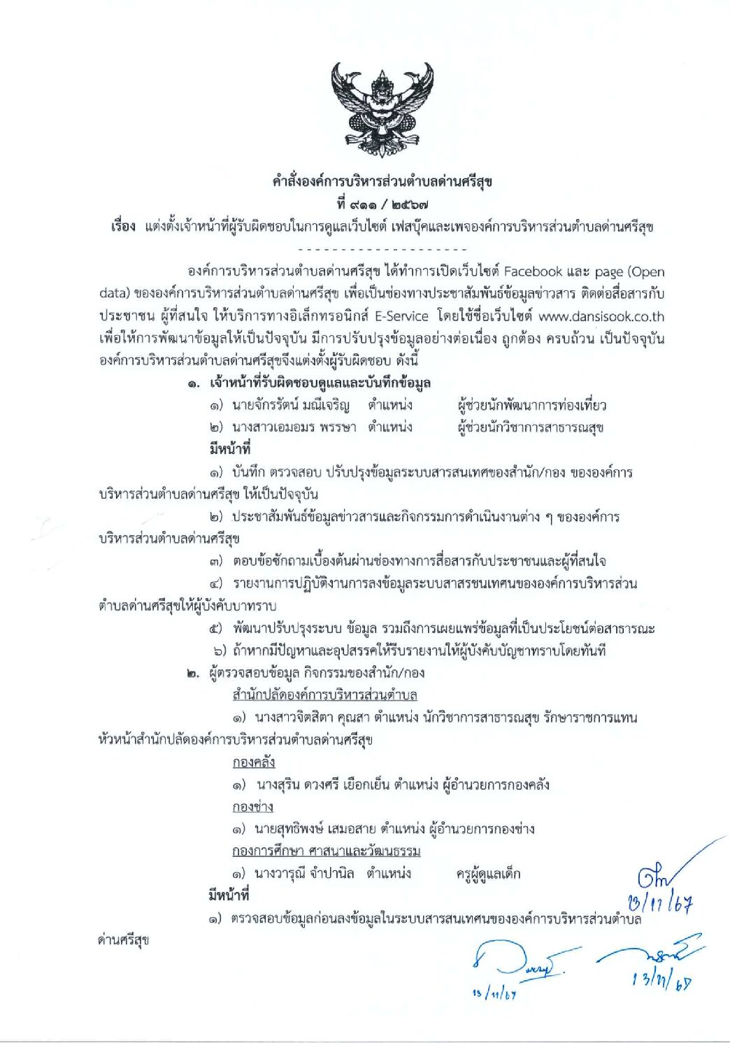 แต่งตั้งเจ้าหน้าที่ผู้รับผิดชอบในการดูแลเว็บไซต์ เฟสบุ๊คและเพจองค์การบริหารส่วนตำบลด่านศรีสุข