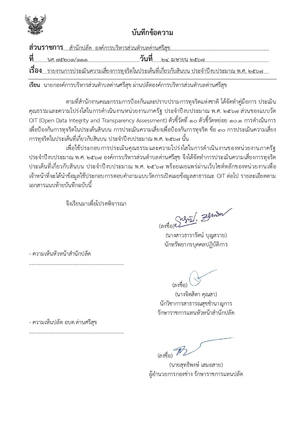 การประเมินความเสี่ยงการทุจริตในประเด็นสินบนของ องค์การบริหารส่วนตำบลด่านศรีสุข